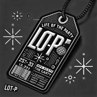 Black and white design featuring a tag with the text 'Life of the Party', 'LO-P', and barcode elements. There are decorative starburst patterns around the tag. The tag is hanging on a cord.